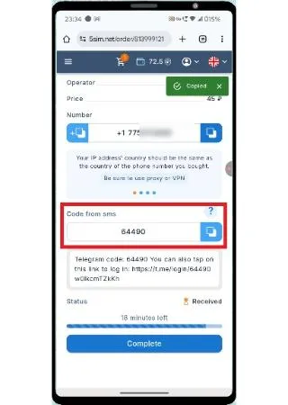 - Now, Use the virtual number to create an account on Telegram, you will get the OTP for registration on 5Sim website.