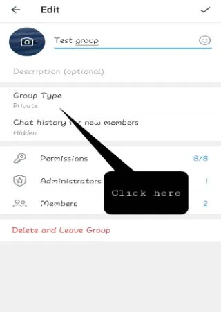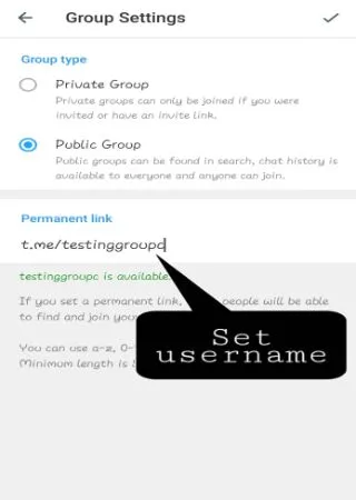 -> If you select public, set unique username for group and click on "correct/save" button on top right corner.
