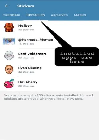 - Now click on 'INSTALLED' tab, you will see all stickers which you have added.